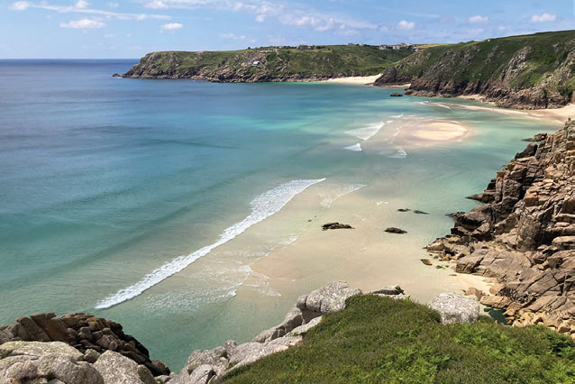 We leave the car park at Botallack and continue on through ruined mine buildings, passing West Wheal Owles made famous by the recent BBC TV series Poldark. We descend into the Kenidjack Valley and then climb back up to reach Cape Cornwall. From the Cape is a further climb to Carn Gloose, then back down into the Cot Valley, another area of heavy historical mining. We continue on passing the beautiful beaches of Gwynver and Sennen before reaching Lands End. Leaving the crowds behind the coast path continues it rollercoaster ride across glorious cliff tops, eventually passing Nanjizal beach and the intriguing navigational day markers on Gwennap Head, to reach our destination of Porthgwarra. Another day of ascent and descent but a little easier than the previous two!